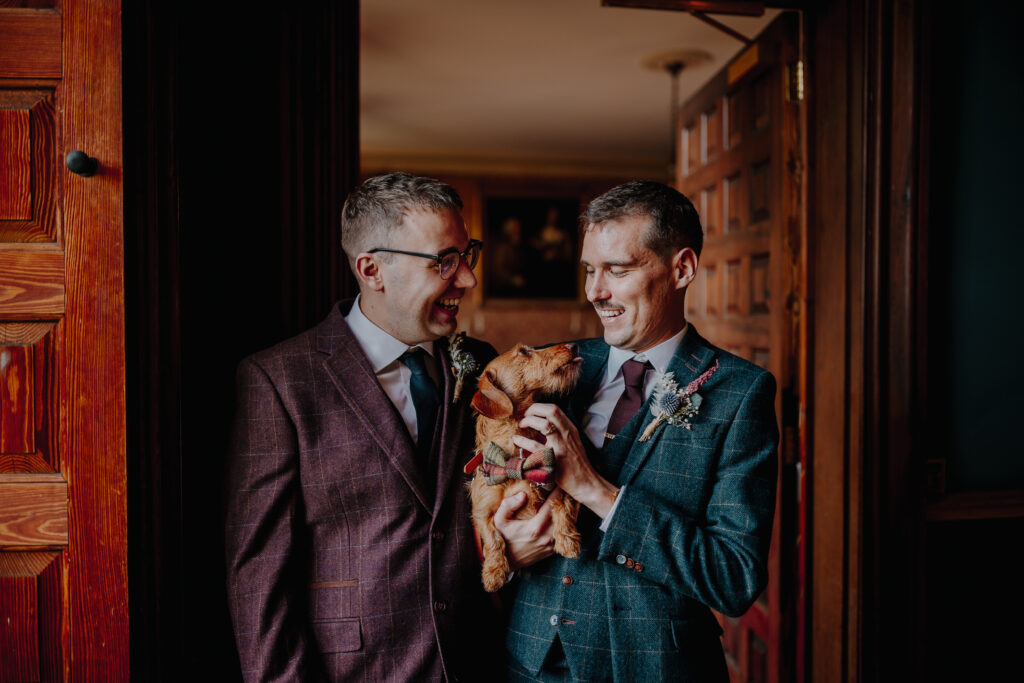 two dog wedding guests being held by the bride and groom during an Elmore Court wedding day