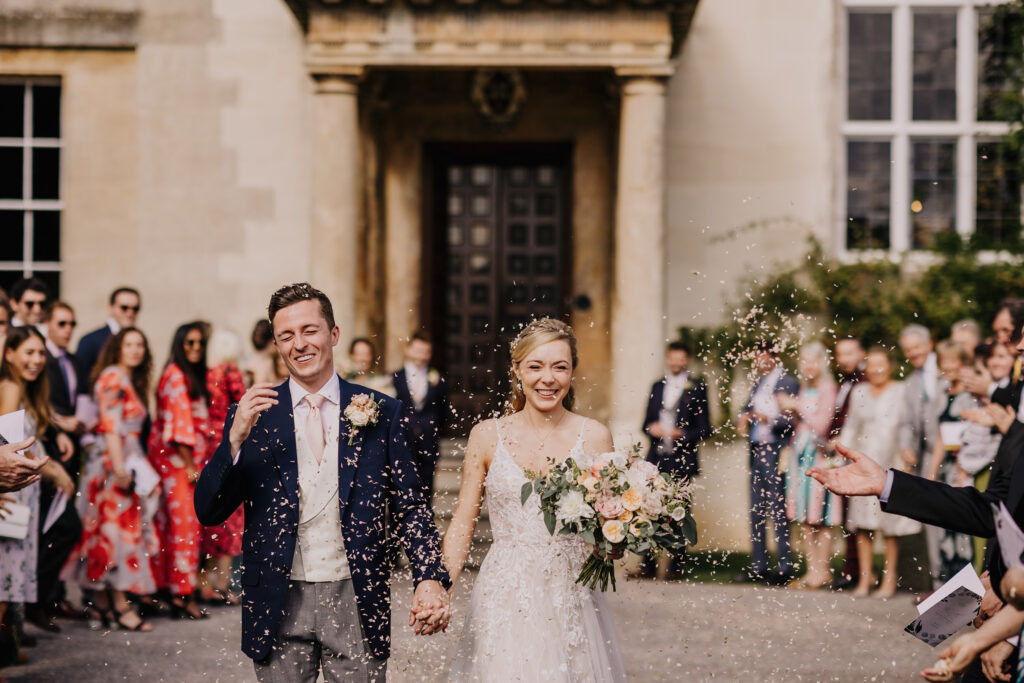 Bride and groom walking through confetti outside Elmore Court, photographed by a recommended Elmore Court wedding photographer.