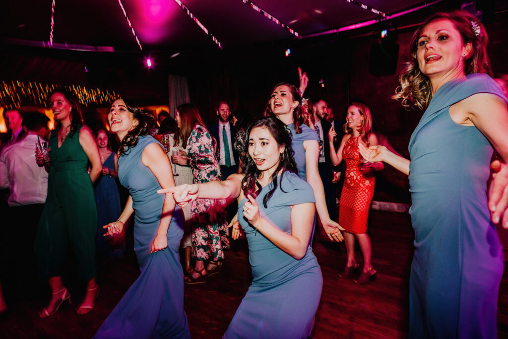 Evening wedding party inside the Gillyflower at Elmore Court with guests dancing and celebrating