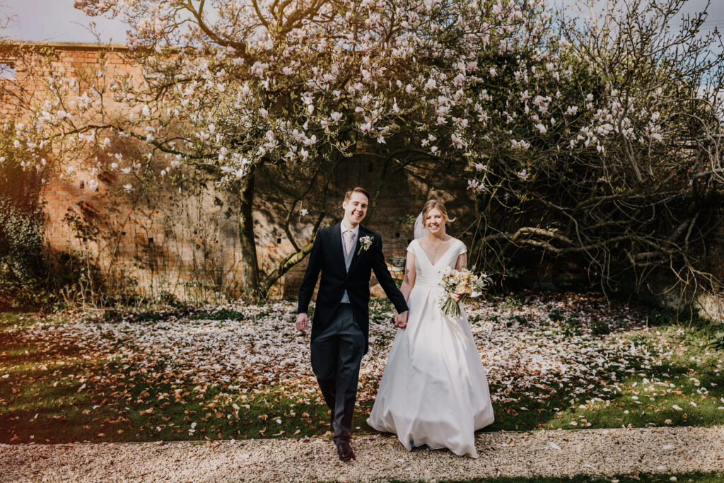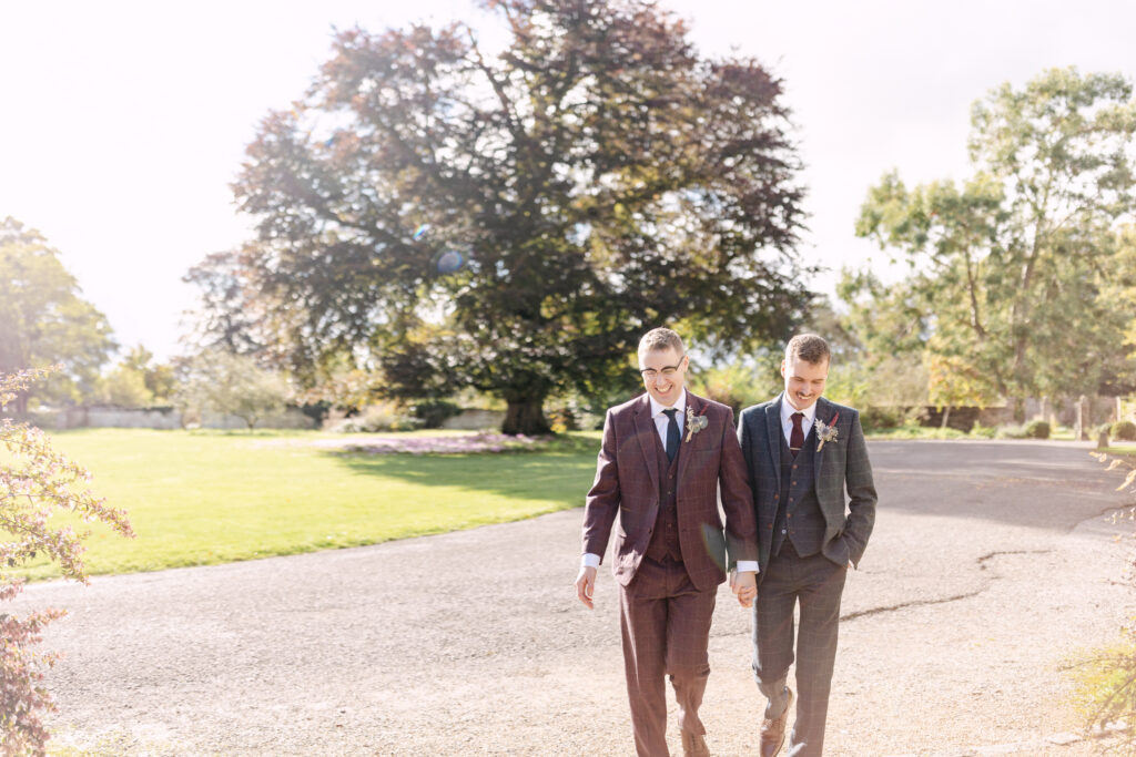 Bride and groom walking together outside Elmore Court in early autumn, surrounded by greenery and soft seasonal light.