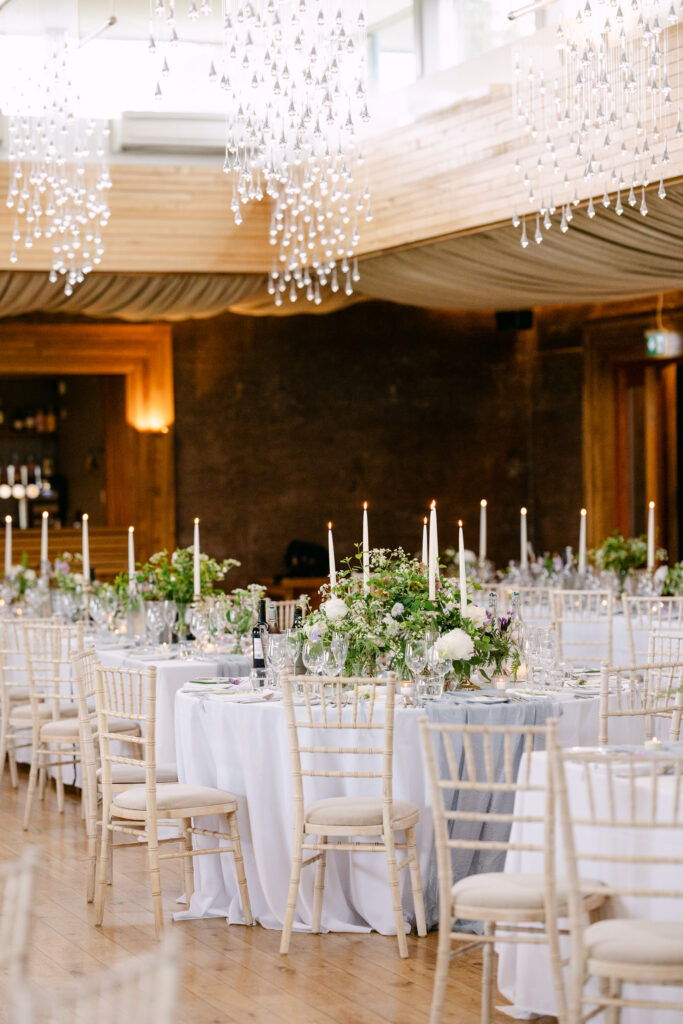 The Gillyflower set up for a wedding breakfast with long tables and flowers and candles shot by an Elmore Court wedding photographer